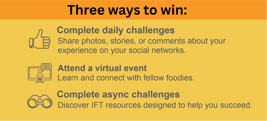 Future leaders rise by learning from the past. Share your leadership journey as a food science student. Tag @iftstudent on Instagram or IFT Student Association on LinkedIn + make sure your post/story is visible. 5 points per submission per person |